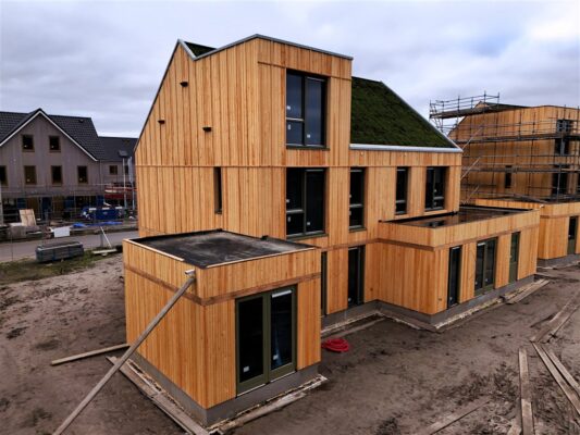 De bouw van Mijn Schuurwoning fase 1 is in volle gang! De contouren van de 7 Laanwoningen en 6 Parkwoningen worden zichtbaar, en het biobased woongebied begint echt vorm te krijgen.