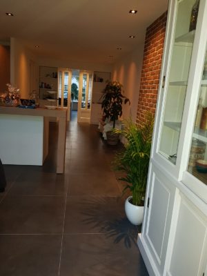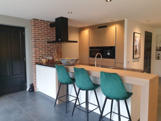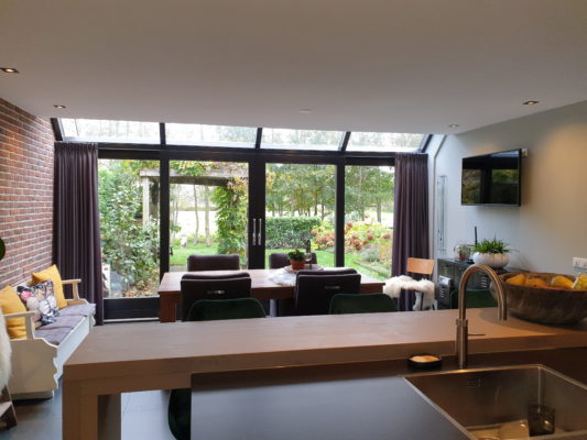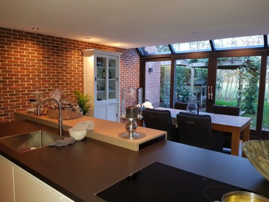 De achtergevel en binnenmuren verwijderd en de bijkeuken bij de keuken getrokken. De bijkeuken is verplaatst naar de garage. Dit alles in een prettige samenwerking met Kobus installatie.
