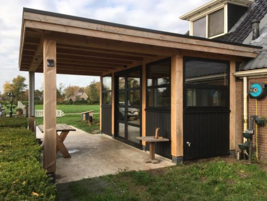 Combinatie van oude en nieuwe metselsteen. Een grote kunststof overkapping met spots.